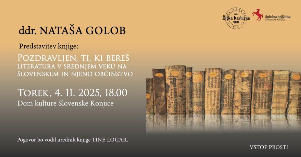 V torek, 4. novembra, ob 18. uri, vabljeni v Dom kulture Slovenske Konjice na predstavitev knjige Pozdravljen, ti, ki bereš: Literatura v srednjem veku na Slovenskem in njeno občinstvo ddr. Nataše Golob, vodilne poznavalke srednjeveške rokopisne dediščine pri nas.