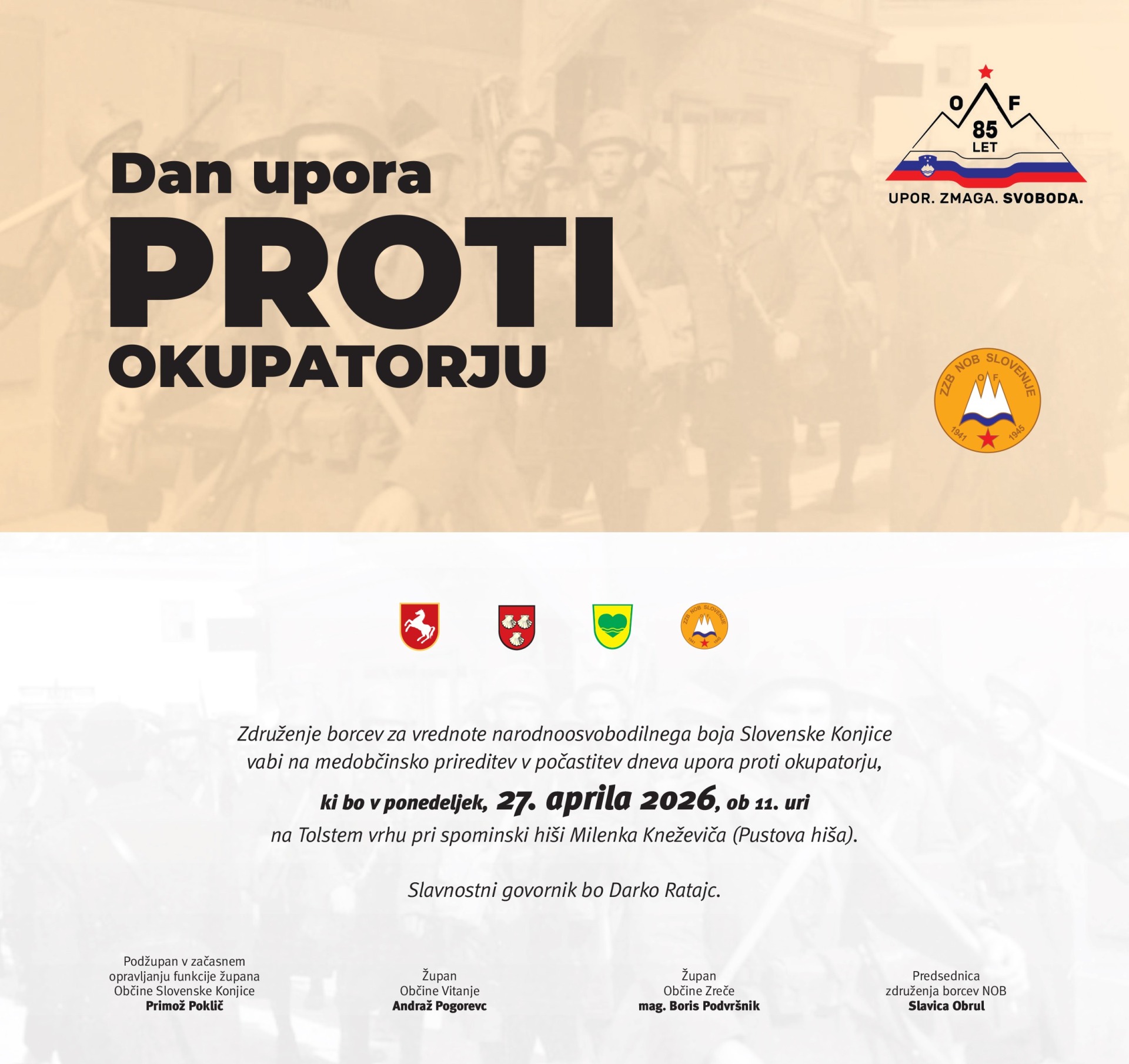Združenje borcev za vrednote narodnoosvobodilnega boja Slovenske Konjice vabi na medobčinsko prireditev v počastitev dneva upora proti okupatorju, ki bo v ponedeljek, 27. 4. 2026 ob 11. uri na Tolstem vrhu pri spominski hiši Milenka Kneževiča (Pustova hiša).