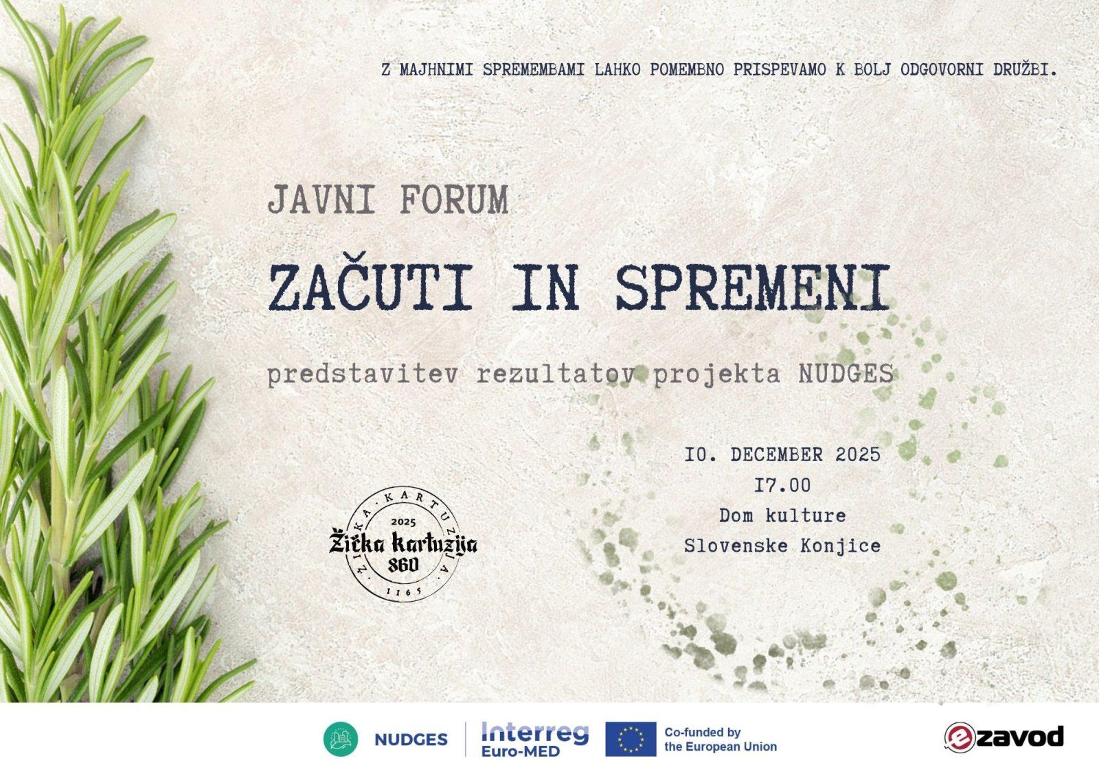 Vabimo vse zainteresirane posameznike, da se nam pridružite na zaključnem dogodku projekta NUdGES, sofinanciranega iz programa Interreg Evromediteran. V okviru projekta smo raziskovali, kako lahko kultura in čutne izkušnje vplivajo na vedenjske spremembe za blaženje podnebnih sprememb.