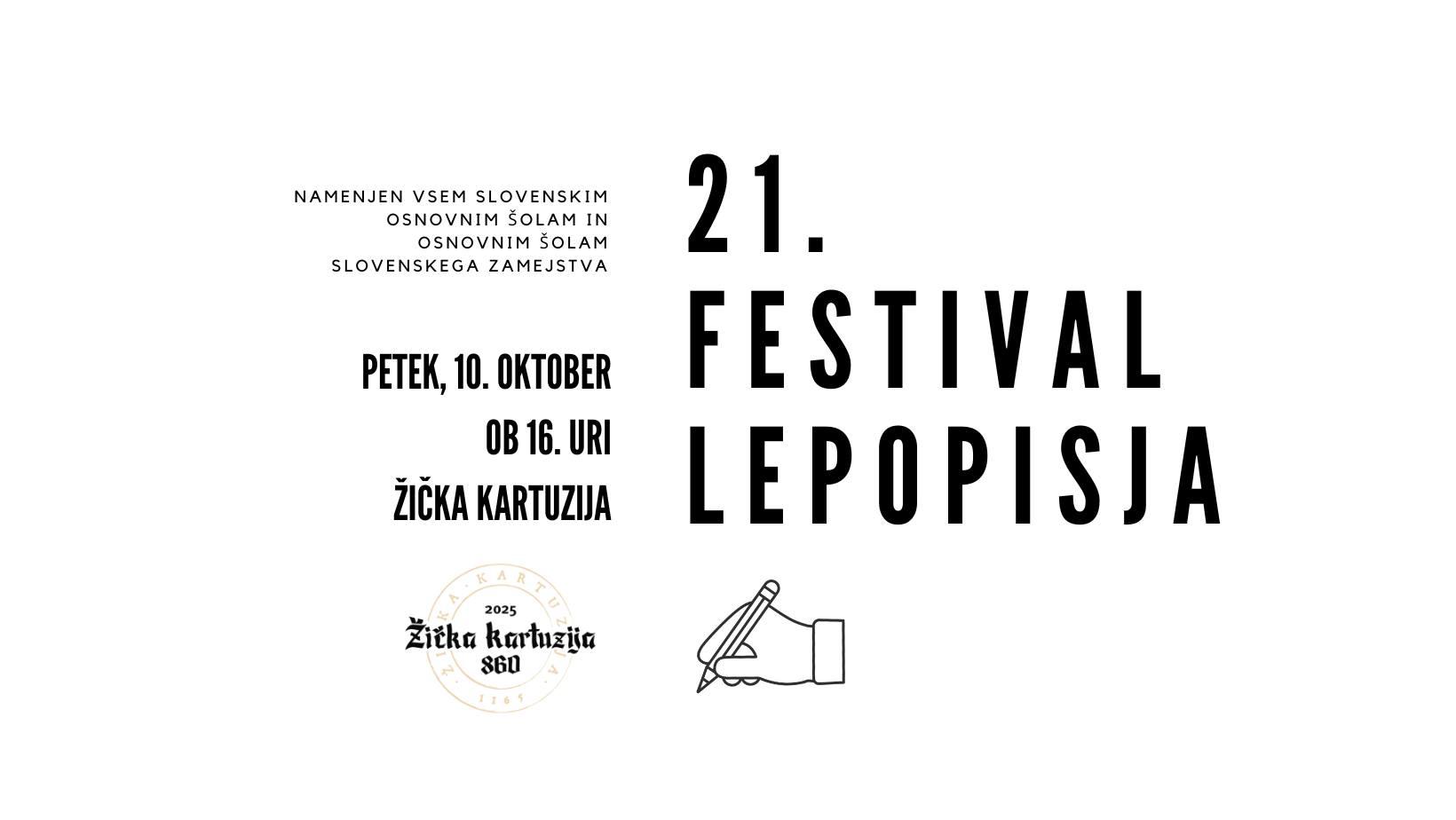 Festival lepopisja ลพe veฤ kot dve desetletji odpira vrata mladim ustvarjalcem, da skozi lepo pisavo razvijajo svojo spretnost, domiลกljijo in estetski ฤut. Tudi letos je vkljuฤen v program ๐๐ป๐ฒ๐๐ผ๐ ๐ฒ๐๐ฟ๐ผ๐ฝ๐๐ธ๐ฒ ๐ธ๐๐น๐๐๐ฟ๐ป๐ฒ ๐ฑ๐ฒ๐ฑ๐ถลกฤ๐ถ๐ป๐ฒ ter ๐ง๐ฒ๐ฑ๐ป๐ฎ ๐ธ๐๐น๐๐๐ฟ๐ป๐ฒ ๐ฑ๐ฒ๐ฑ๐ถลกฤ๐ถ๐ป๐ฒ ๐ฎ๐ฌ๐ฎ๐ฑ (27. 9.โ11. 10.), ki potekata pod naslovom “๐ก๐ช๐ฅ๐ฐ๐ท๐ช ๐ฏ๐ขลก๐ฆ ๐ฑ๐ณ๐ฆ๐ต๐ฆ๐ฌ๐ญ๐ฐ๐ด๐ต๐ช, ๐ต๐ฆ๐ฎ๐ฆ๐ญ๐ซ ๐ฏ๐ขลก๐ฆ ๐ฑ๐ณ๐ช๐ฉ๐ฐ๐ฅ๐ฏ๐ฐ๐ด๐ต๐ช”.